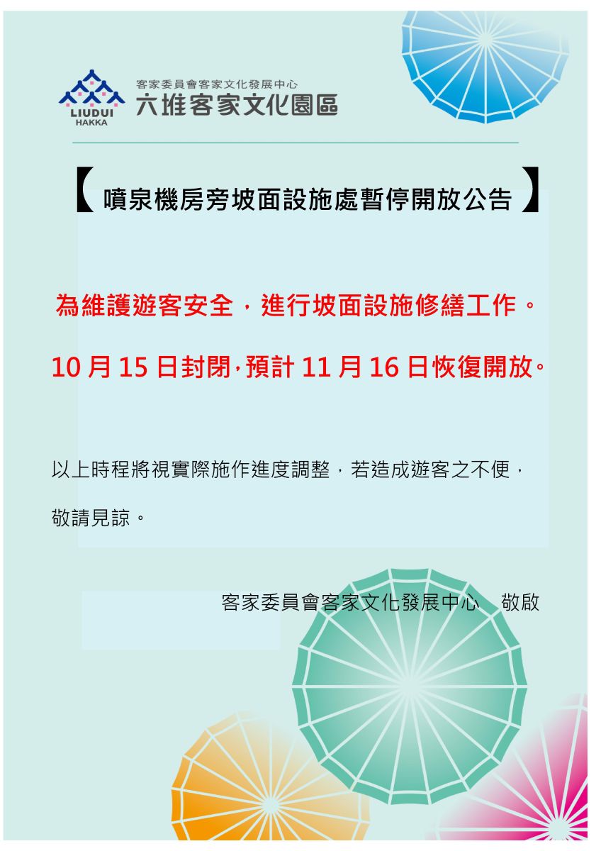 【噴泉機房旁坡面設施處暫停開放公告】為維護遊客安全,進行坡面設施修繕工作。